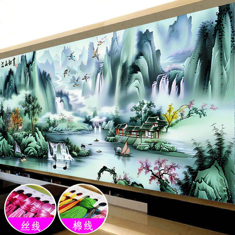 流水生财2025年新款十字绣线绣客厅山水风景大画手工自己刺绣大气