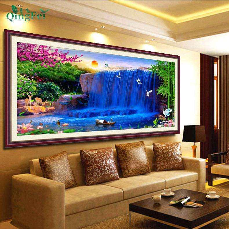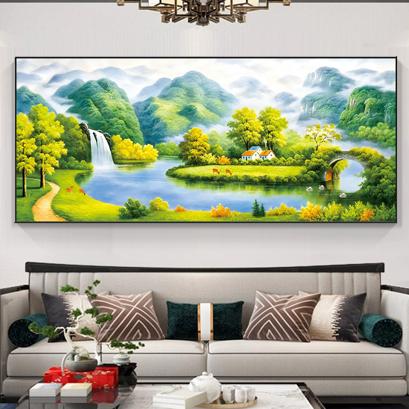 流水生财十字绣线绣2025年新款客厅手工自己绣刺绣大幅风景山水画