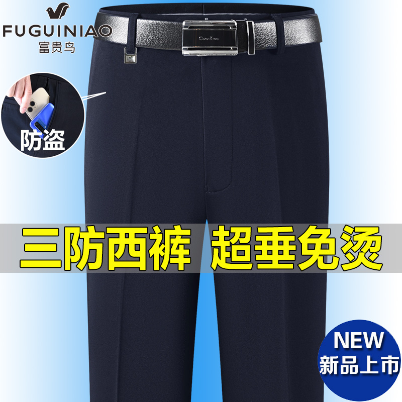 富贵鸟秋冬厚款三防西裤男直筒免烫中年毛蚕丝高腰宽松防盗西装裤