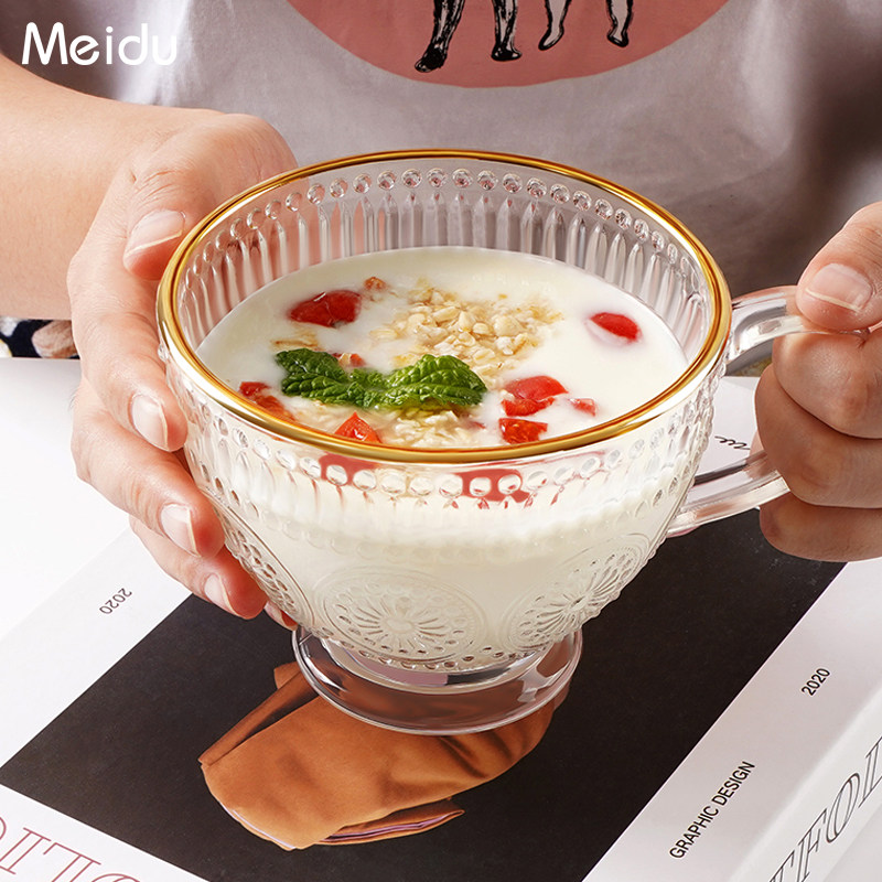 ins风复古太阳花金片带把玻璃杯 高级感家用泡茶杯牛奶杯喝水杯子