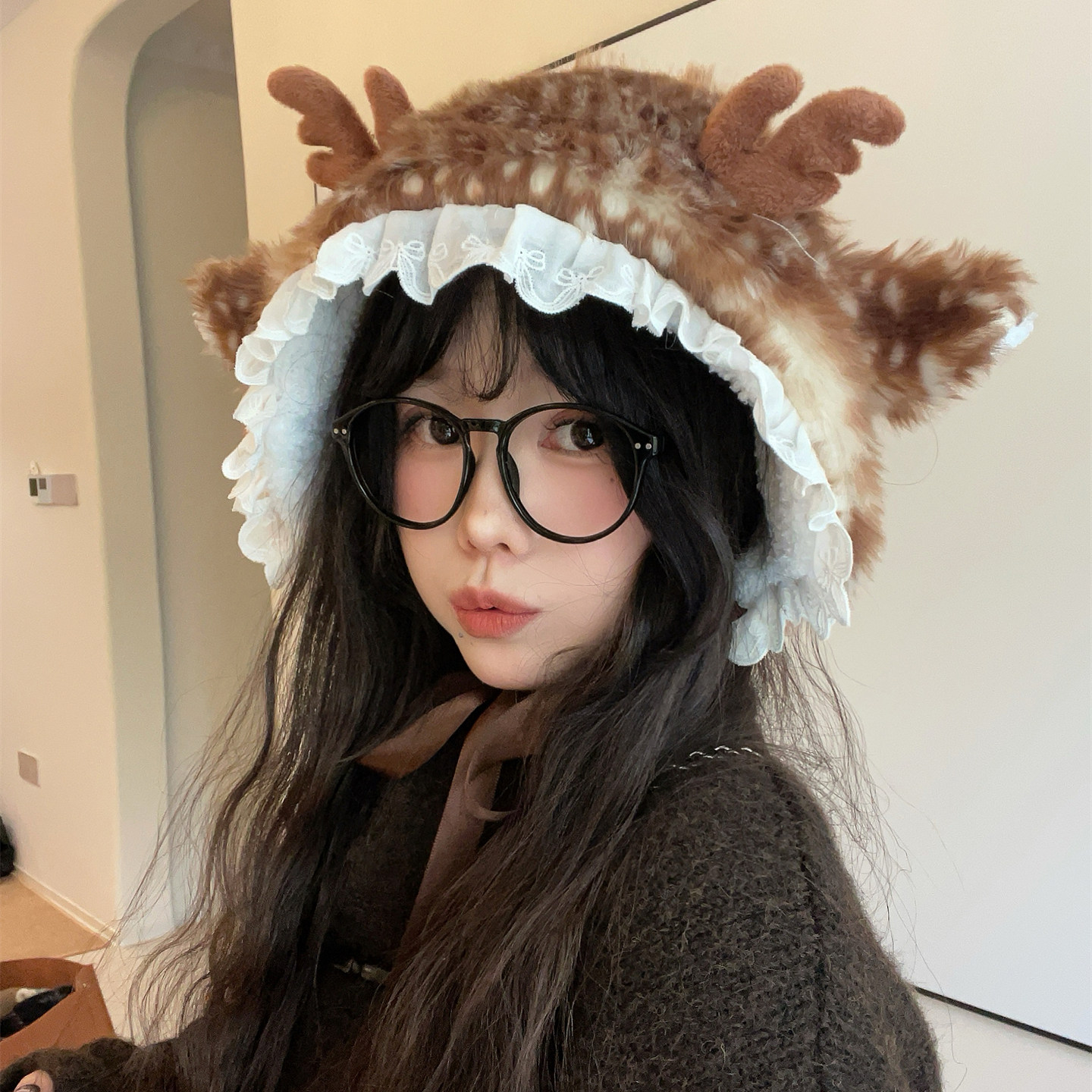 森女日系麋鹿圣诞节装扮毛绒蕾丝边鹿角可爱加厚保暖护耳耳罩发带