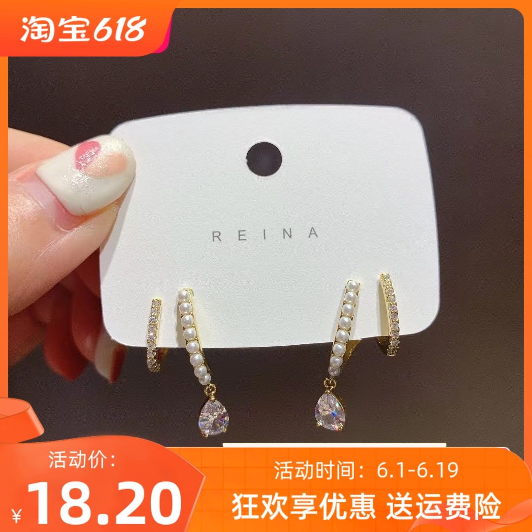 鹿小众人饰品珍珠竖条水滴抖音HIluck同款弯曲气质水晶锆石耳环