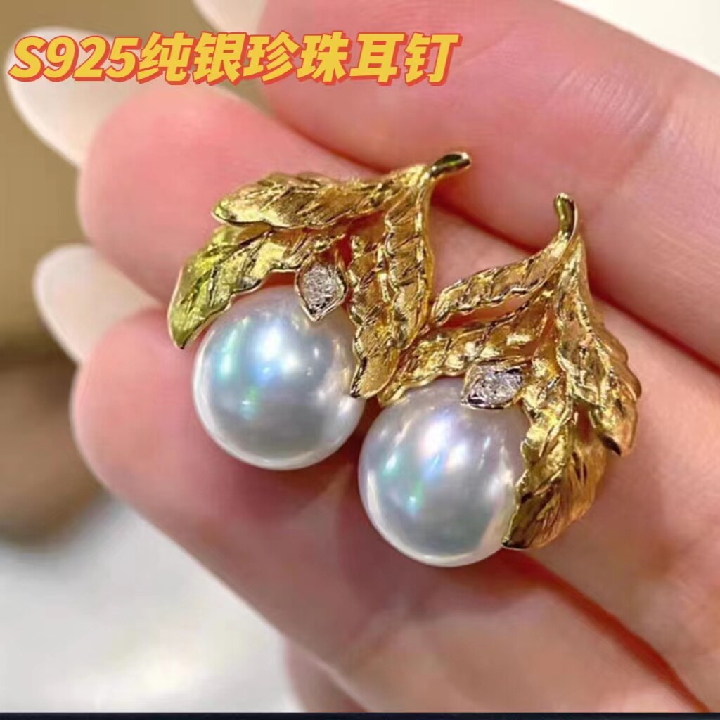 DIY珍珠配件S925纯银镀真金复古树叶耳钉耳环耳勾空拖配件女饰品