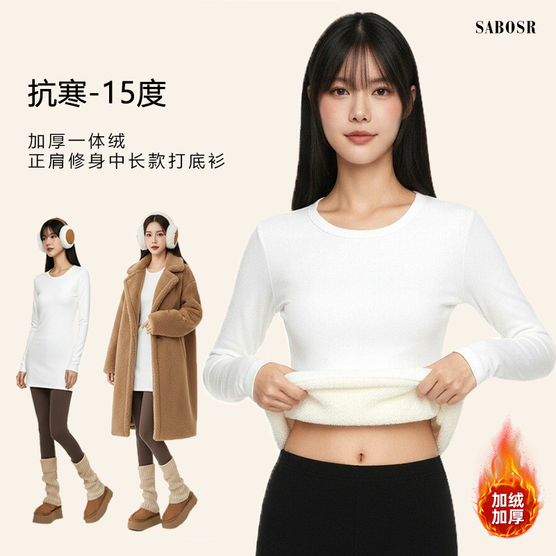 秋冬季加绒加厚中长款保暖上衣修身包臀打底衫大码长袖纯棉t恤女