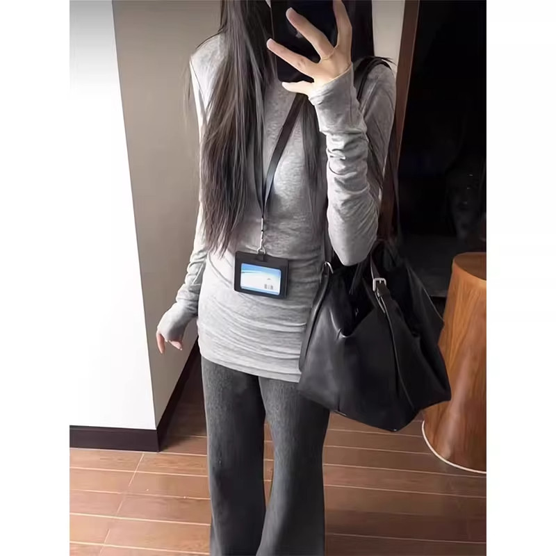 灰色中长款打底衫女秋冬季内搭正肩长袖纯棉t恤圆领叠穿修身上衣
