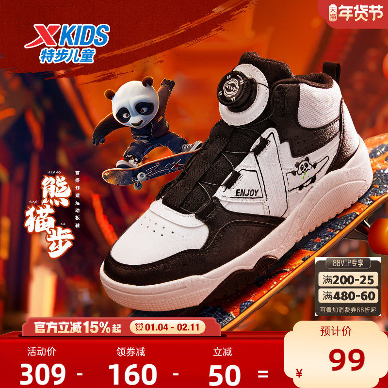 特步童鞋2025年秋冬款熊猫鞋儿童运动鞋旋转扣板鞋男童黑白休闲鞋