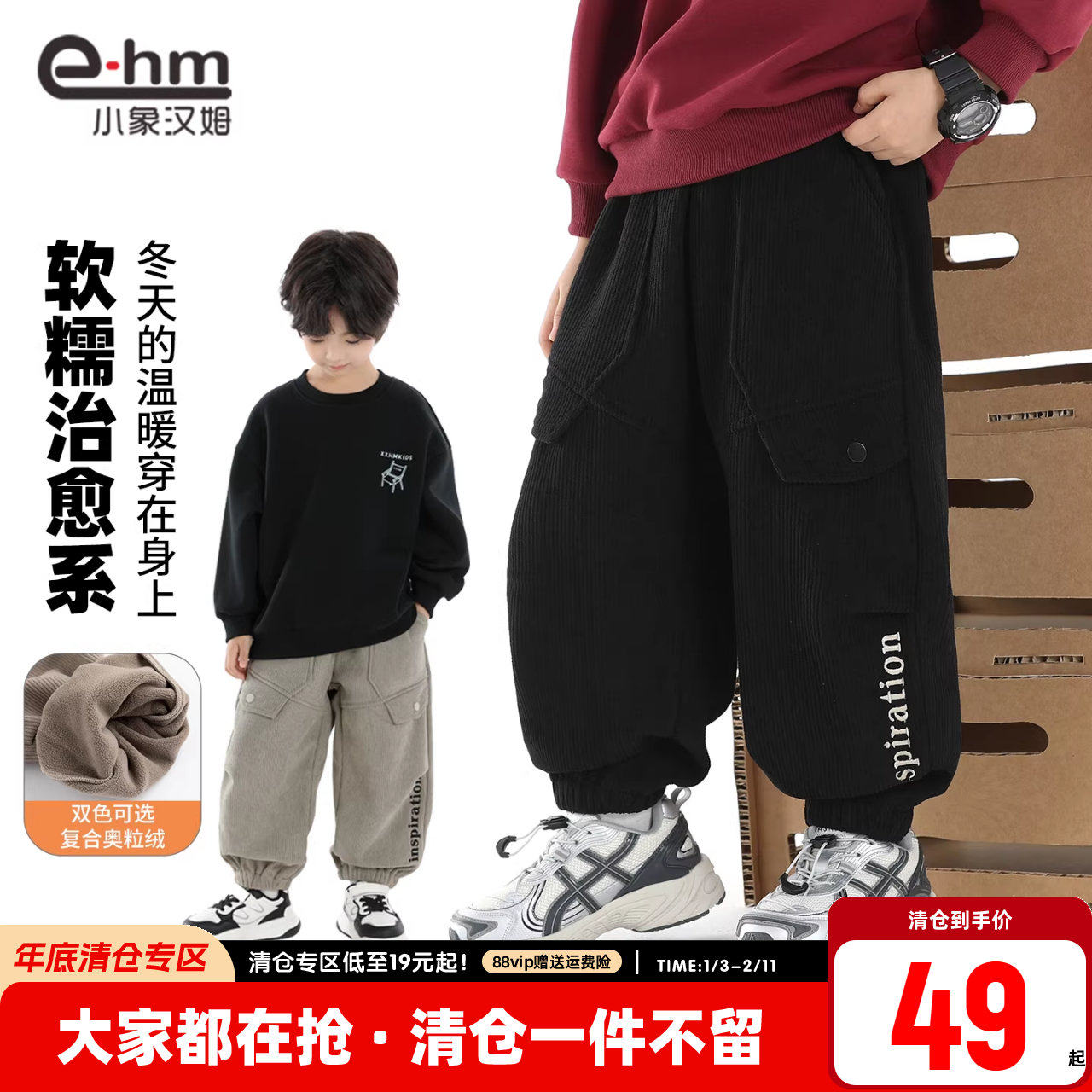 小象汉姆童装男童灯芯绒裤儿童休闲裤2025冬装新款加绒裤子宽松潮