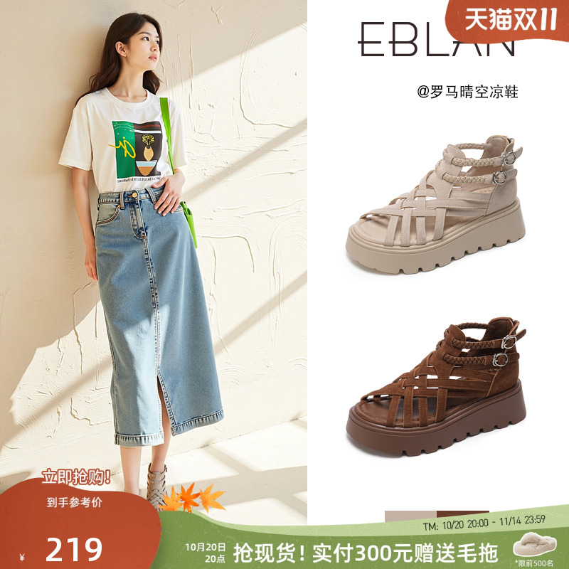 EBLAN/伊伴厚底罗马凉鞋女2025夏季新款高帮松糕鞋女士露趾猪笼鞋