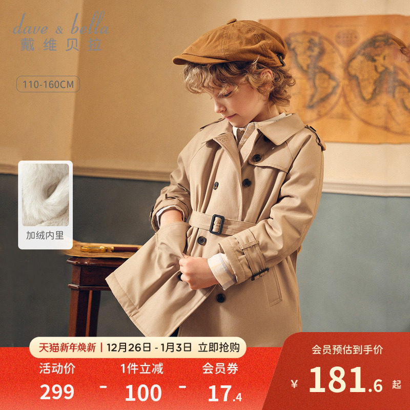 戴维贝拉男童中长款风衣2025冬新款儿童英伦风外套女大童加绒上衣