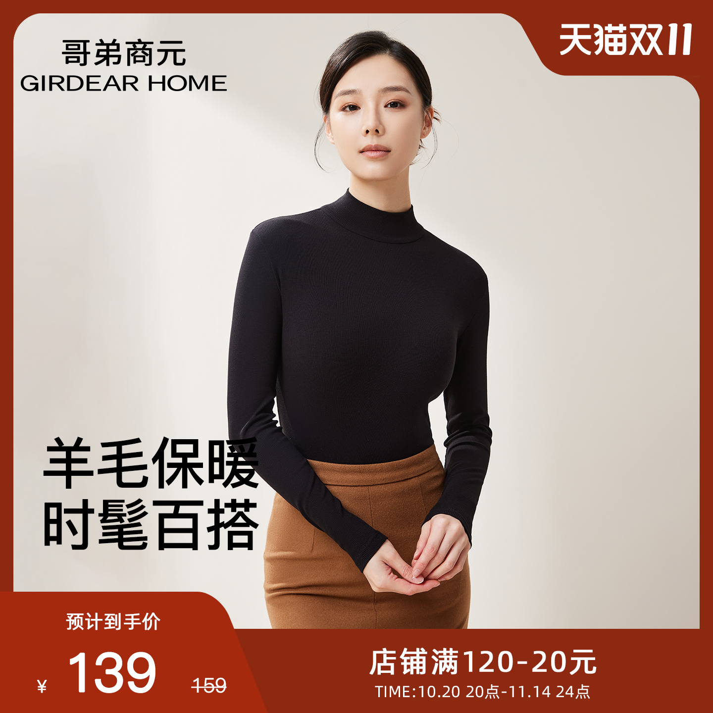 哥弟商元小高领羊毛长袖打底衫女士秋冬内搭上衣舒适保暖秋衣修身
