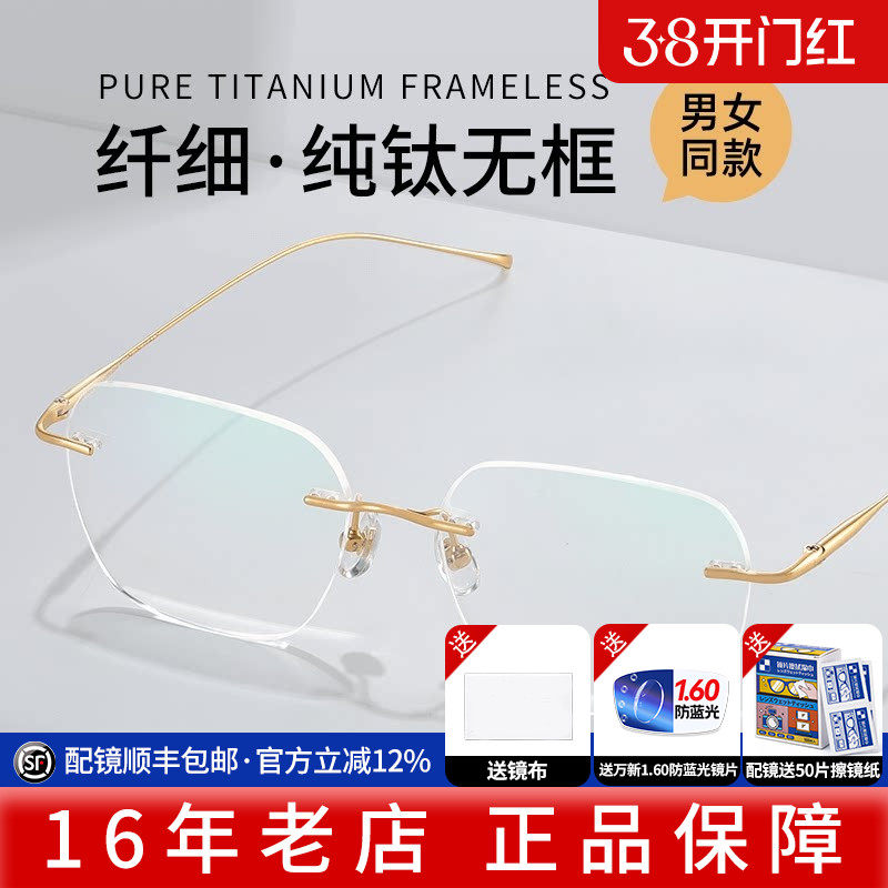 纯钛无框眼镜男款近视可配度数超轻无边框金丝眼镜框镜架女防蓝光