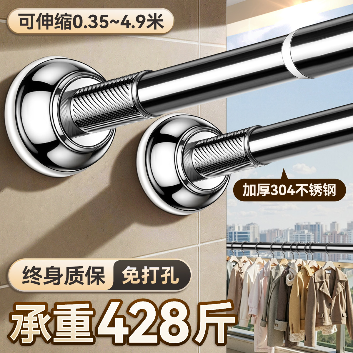 免打孔伸缩杆窗帘杆浴帘杆免安装晾衣杆衣柜杆子门帘杆不锈钢直杆