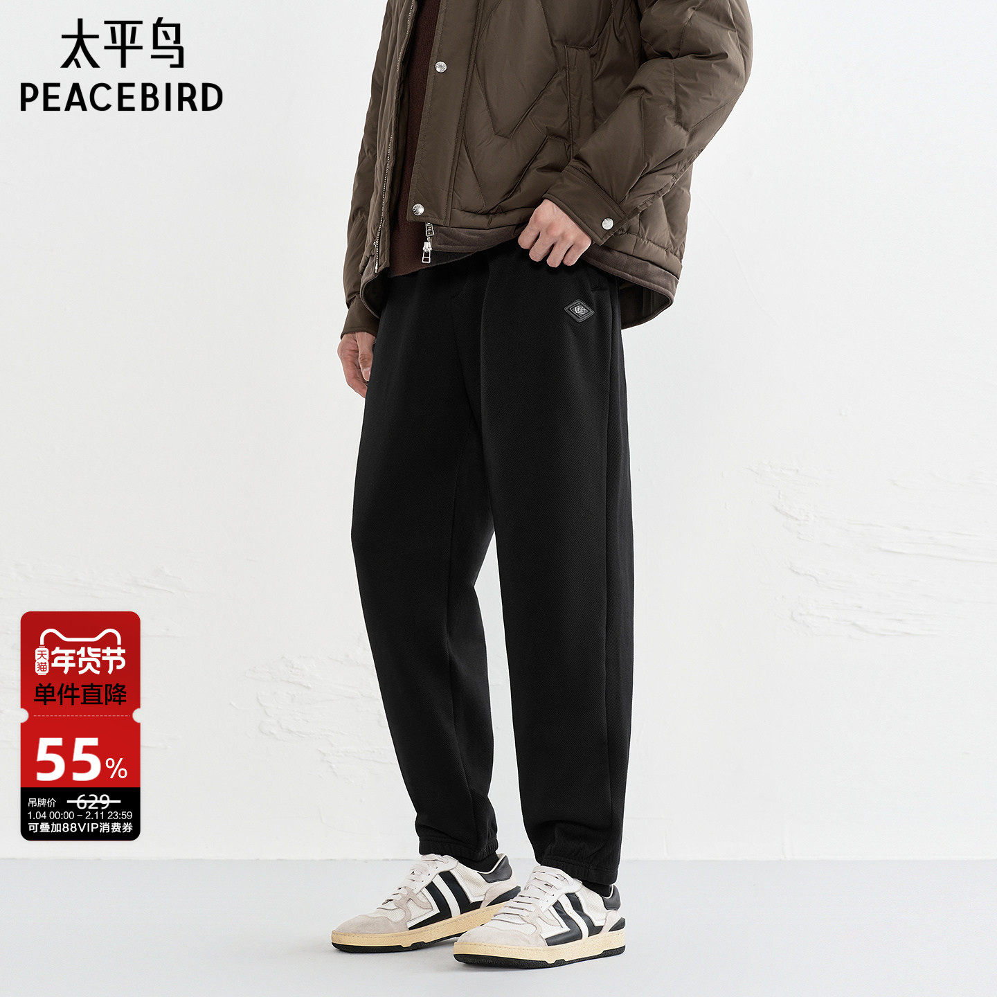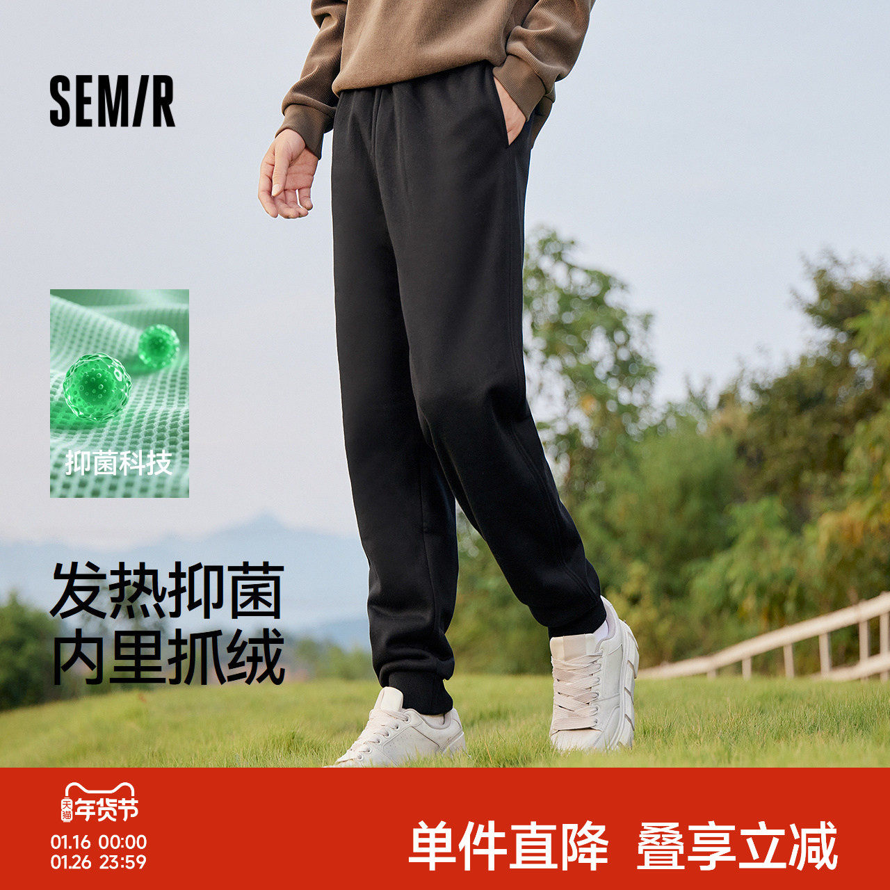 [商场同款]森马加绒卫裤男2025冬款宽松运动黑色束脚裤男加厚
