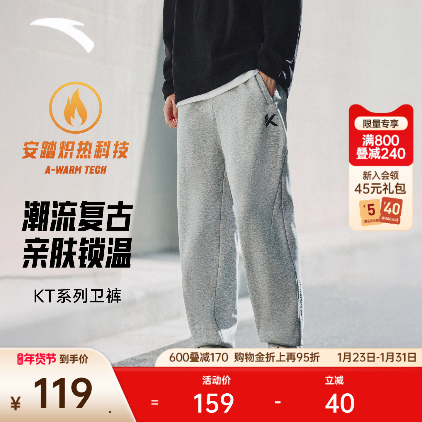 安踏KT运动卫裤男士冬季新款加绒灰色休闲长裤宽松束脚裤运动裤子