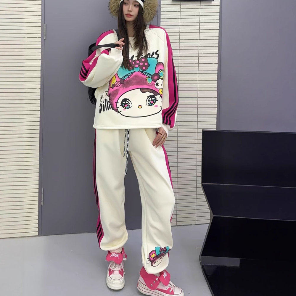 拼接撞色加绒卡通套装女秋冬款2025新款韩版条纹加厚卫衣束脚卫裤