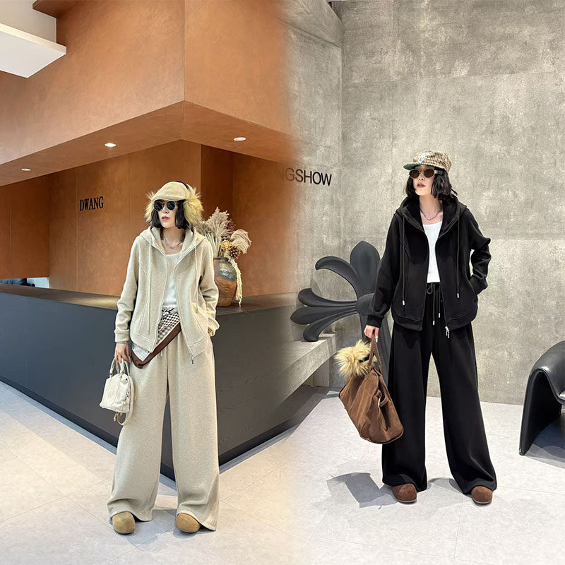 胖妹妹韩系加绒套装女秋冬款200斤宽松外套阔腿裤两件套大码女装