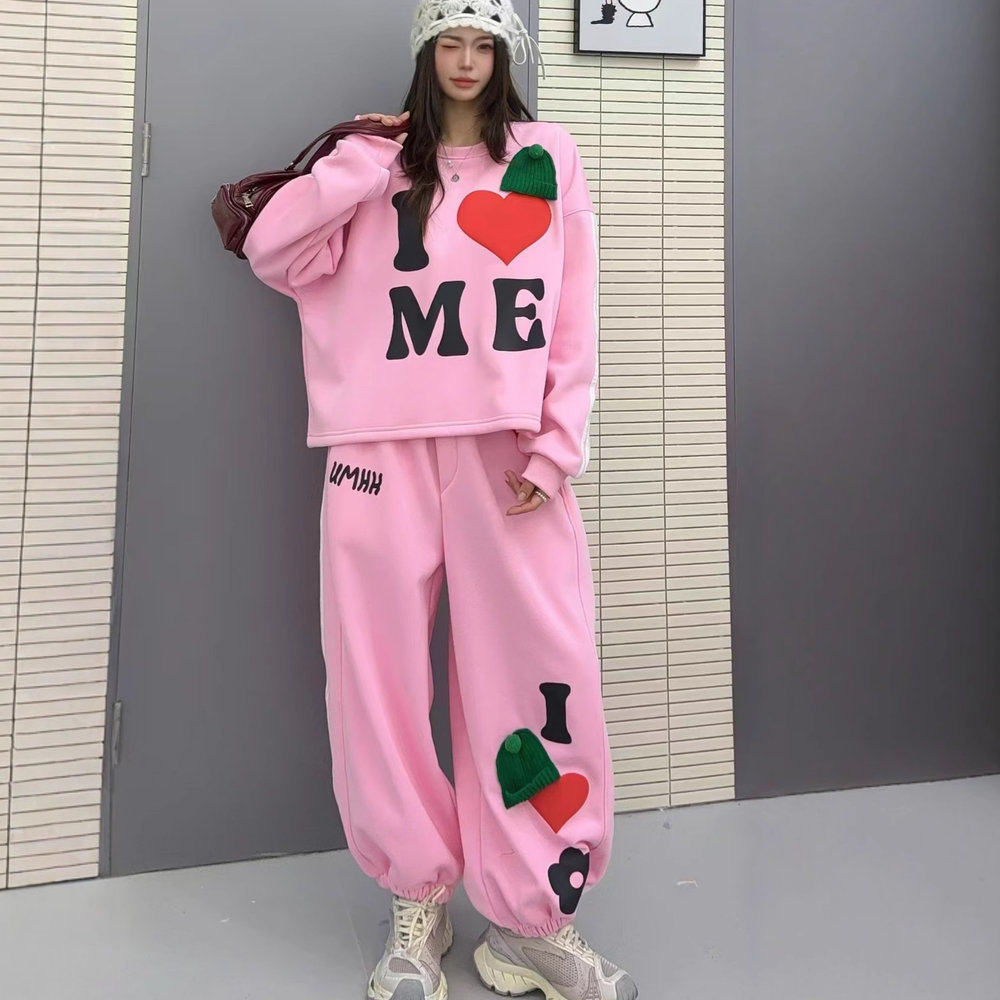加绒套装女秋冬款装饰爱心涂鸦一体绒卫衣休闲运动萝卜卫裤两件套