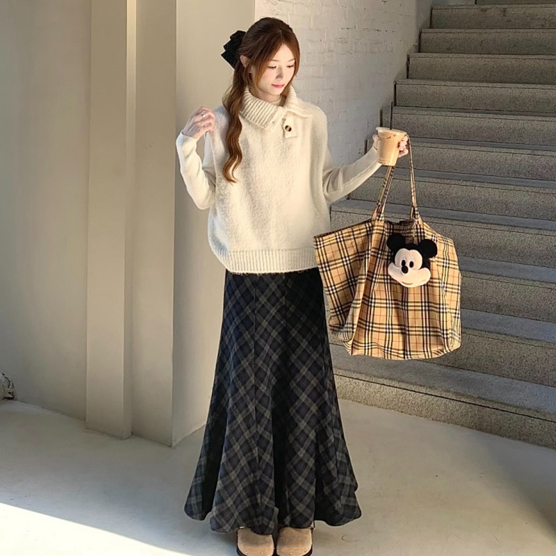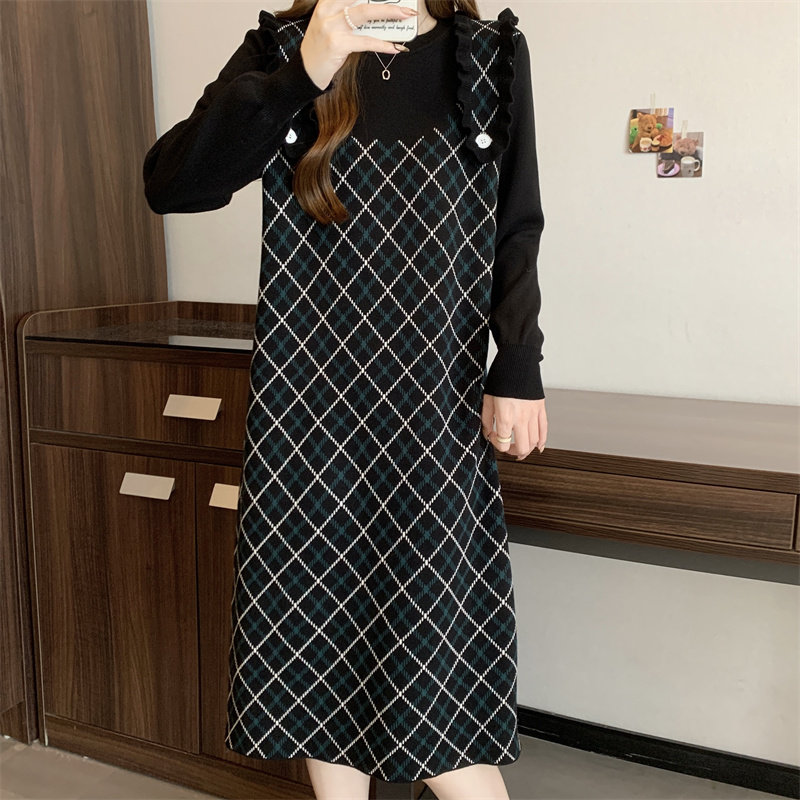 大码女装胖mm秋冬款叠穿背心马甲针织打底毛衣格纹鱼尾半身裙套装