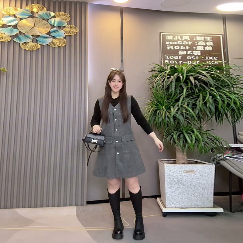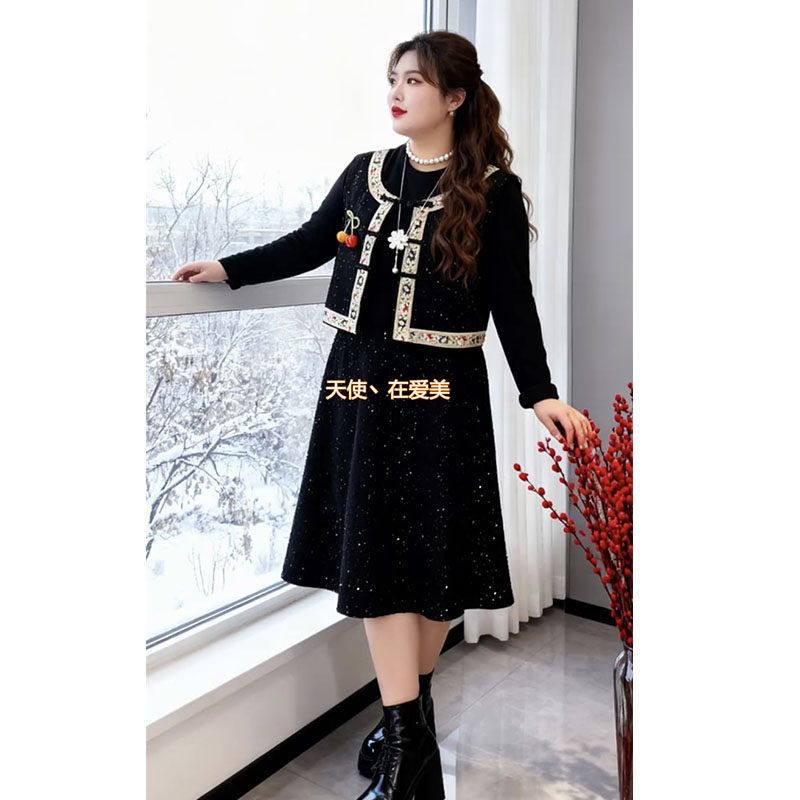 胖妹妹套装立领长袖打底衫马甲裙加肥大码女装秋冬款显瘦两件套潮