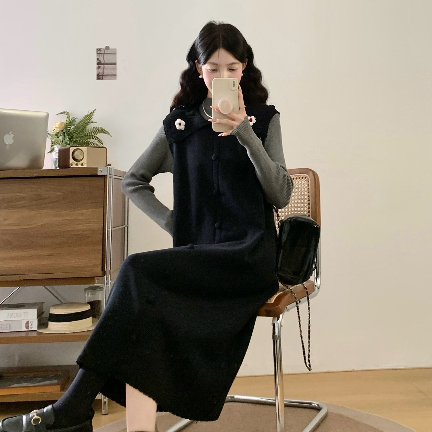 大码女装秋冬款高端气质复古国风显瘦连衣裙时尚盘扣马甲两件套装