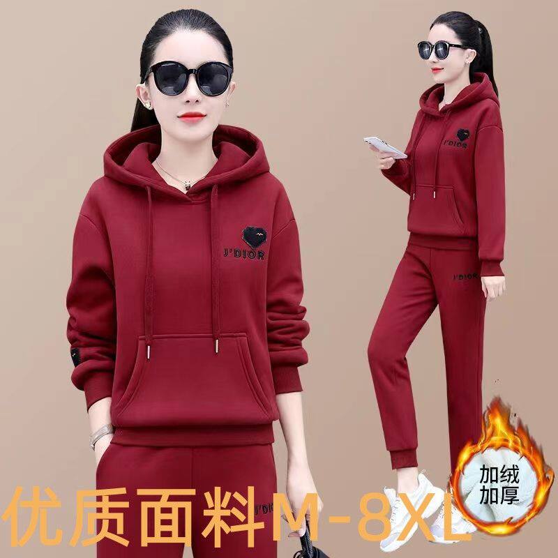 大码秋冬款加绒加厚妈妈装连帽运动卫衣套装2025新款时尚两件套