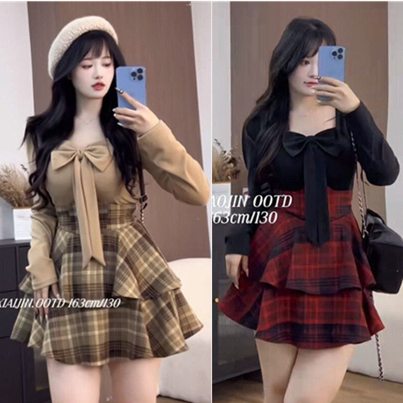 大码微胖mm韩版复古学院套装秋冬款显瘦时尚格子上衣束腰两件套女