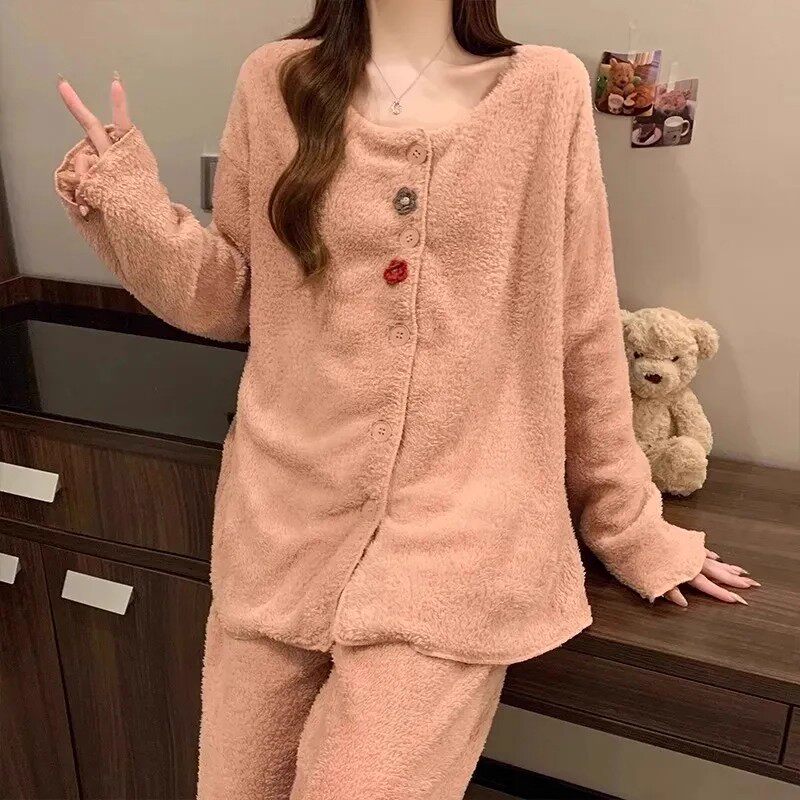 珊瑚绒睡衣女秋宽松开衫式纽扣长裤家居服套装保暖大码300斤冬款