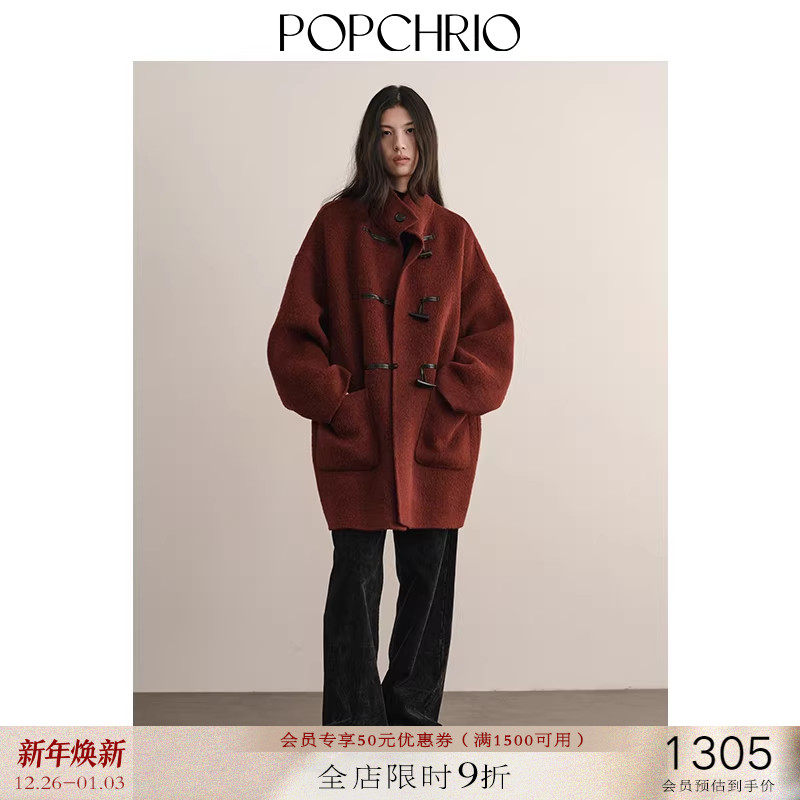 POPCHRIO欧可芮◆苏丽羊毛立领牛角扣双面呢大衣小个子毛呢外套女