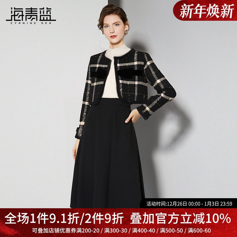 海青蓝小香风套装2024新款女装秋冬红色格子外套毛呢半身裙两件套