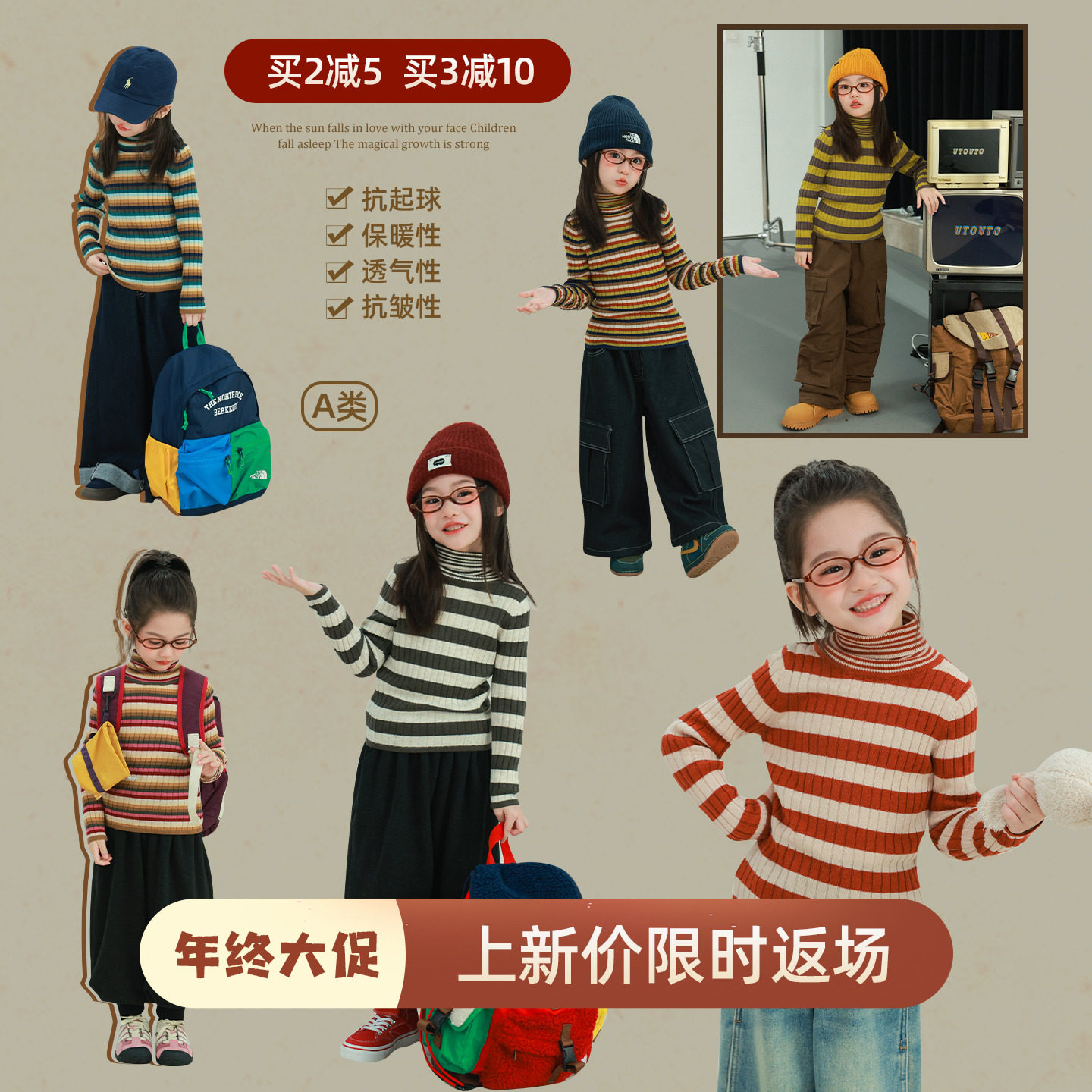 女童高领毛衣冬装2025新款洋气儿童宽松百搭条纹针织衫女孩打底衫