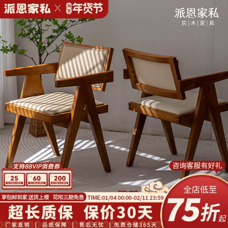 原木风餐椅实木家用餐桌吃饭椅子昌迪加尔椅软包带扶手藤编靠背椅