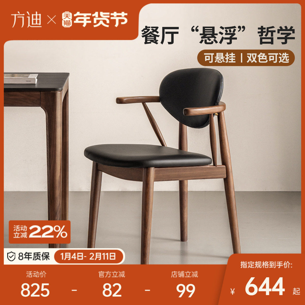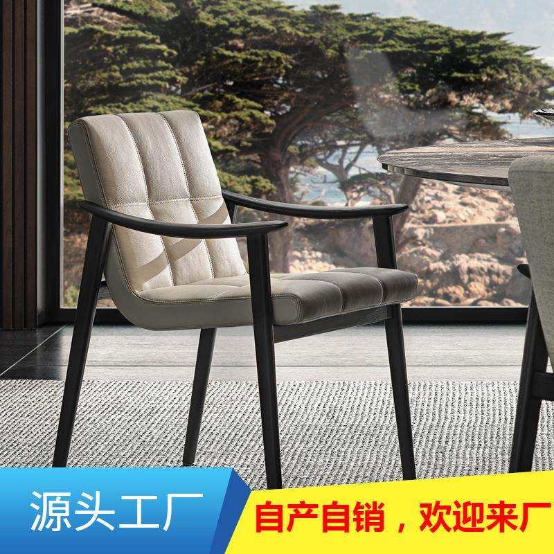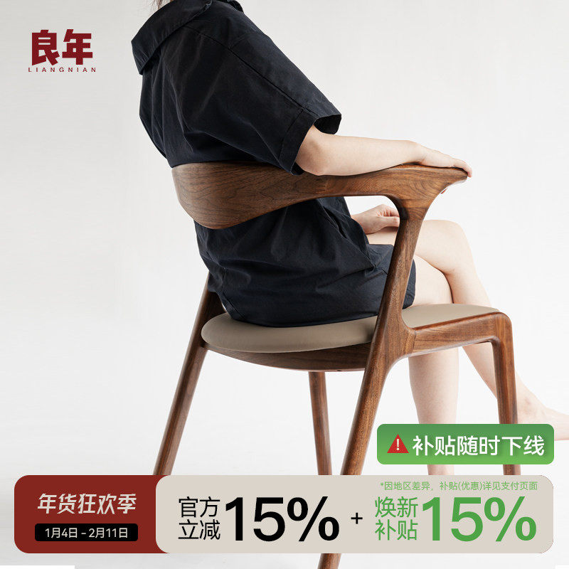 良年 蜜思餐椅实木椅子靠背带扶手北欧牛皮黑胡桃木现代茶椅家用