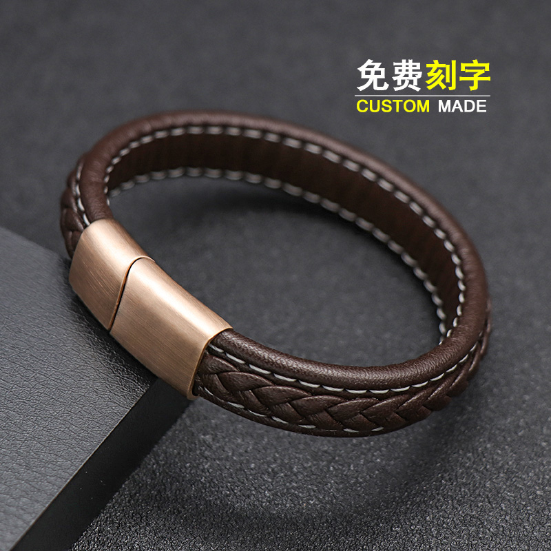 欧美复古棕色皮绳手镯简约百搭潮人男女手链手环磨砂哑光钛钢刻字