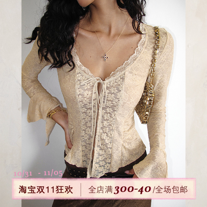 AZure法式复古深V绑带连衣裙收腰蕾丝花边长裙长袖显瘦红色茶歇裙