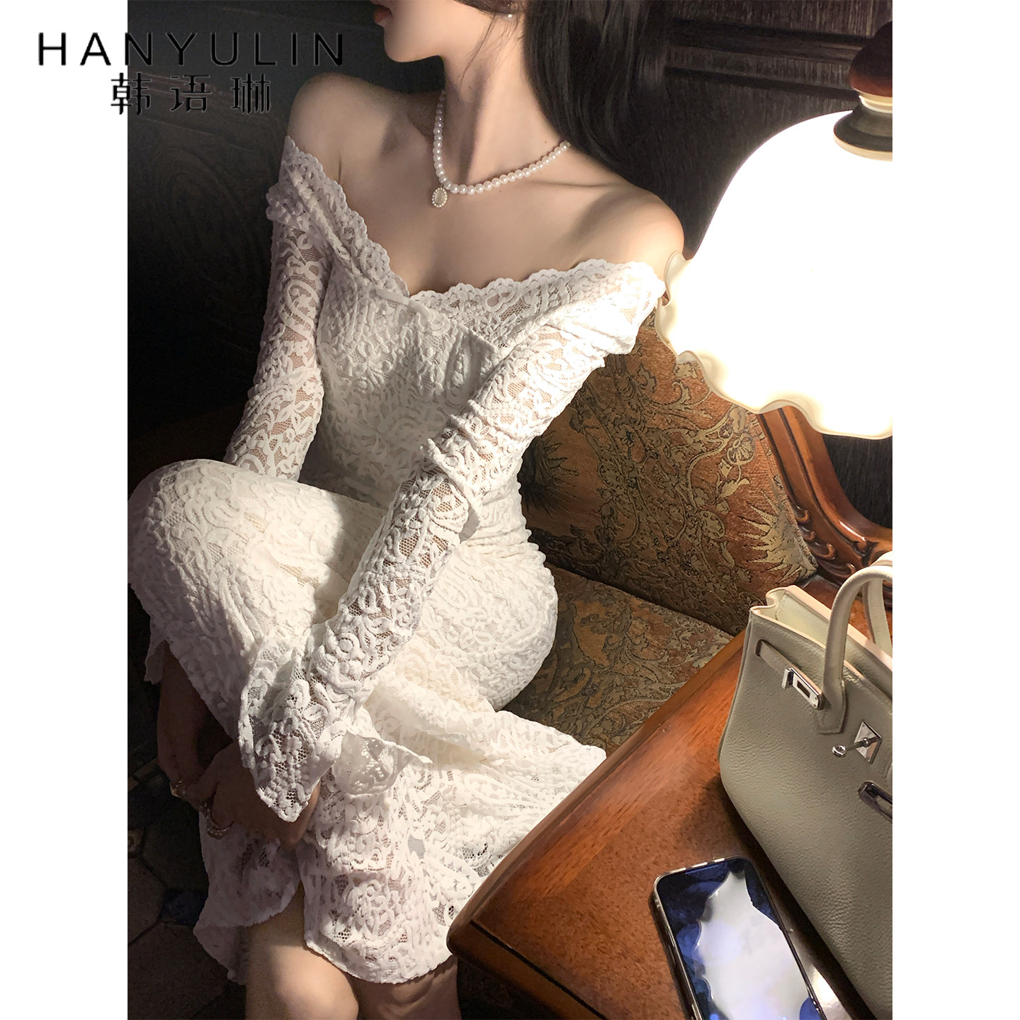 韩语琳 纯欲蕾丝一字肩长袖连衣裙女冬法式优雅气质修身鱼尾长裙