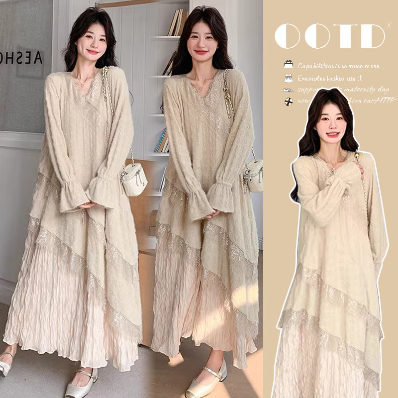 孕妇装重工针织提花压褶孕期连衣裙女秋冬长袖蕾丝长裙内搭设计感