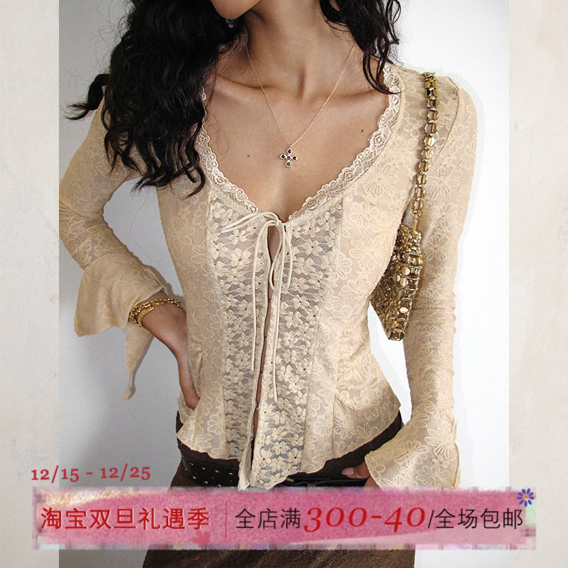 白里 风之羽 复古蕾丝V领拼接长袖针织连衣裙温柔氛围感内搭长裙