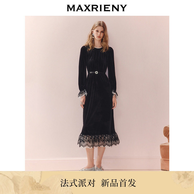 MAXRIENY复古赫本风丝绒连衣裙25秋款优雅感长袖蕾丝花边收腰长裙