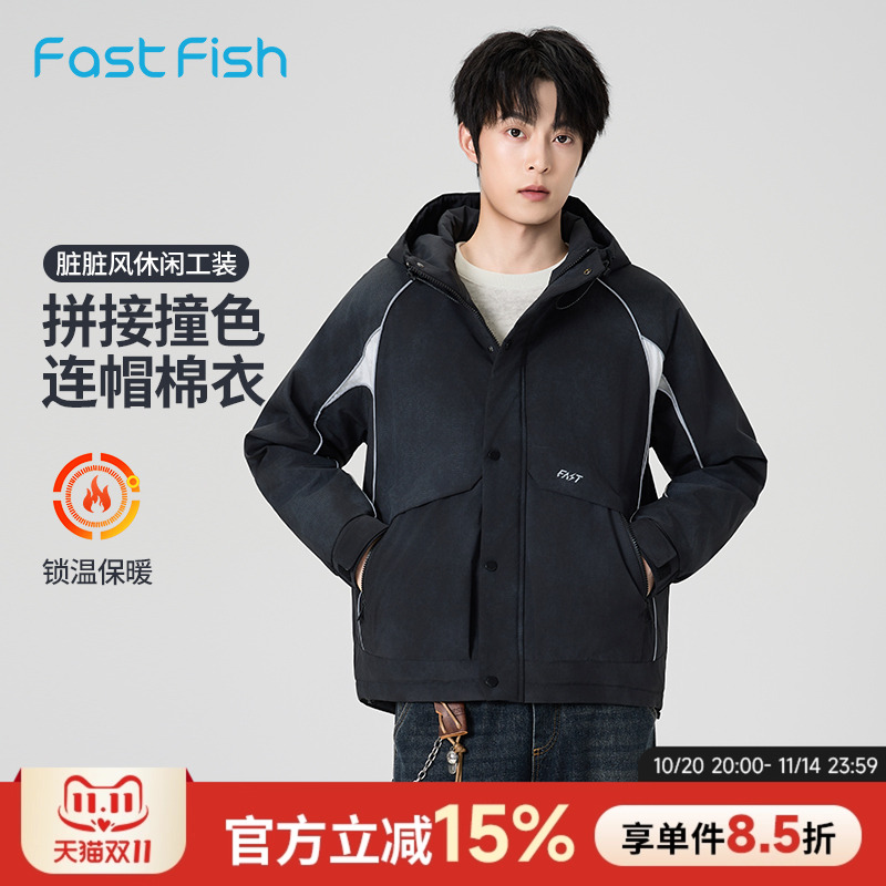 快鱼宽松休闲工装男款棉衣25年冬新款撞色拼接脏脏风连帽外套男潮