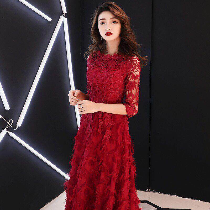 Ocnltiy酒红色长袖敬酒服新娘春秋结婚回门气质显瘦长款晚礼服女