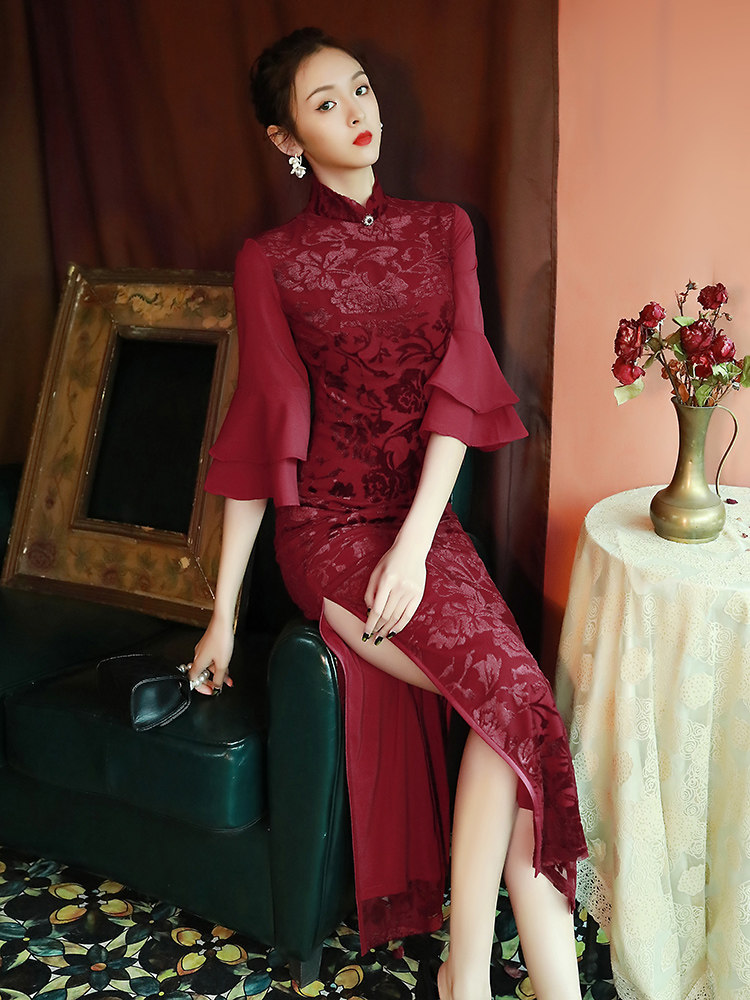 酒红色旗袍2022年新款气质优雅长款复古中国风新娘敬酒服连衣裙女
