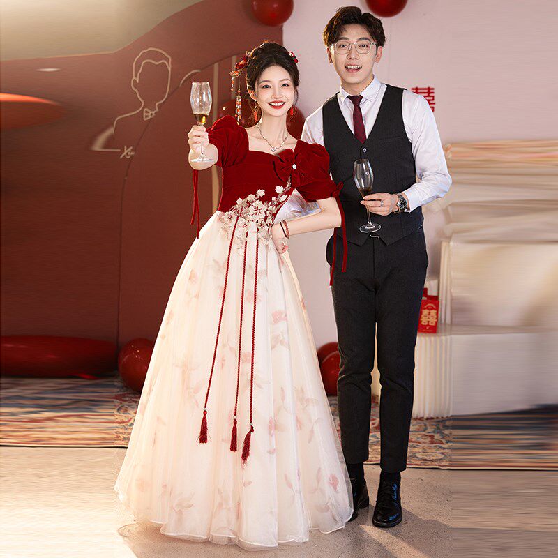 酒红色绒面吊带新娘敬酒服2025新款订婚回门花朵晚礼服长款显瘦秋