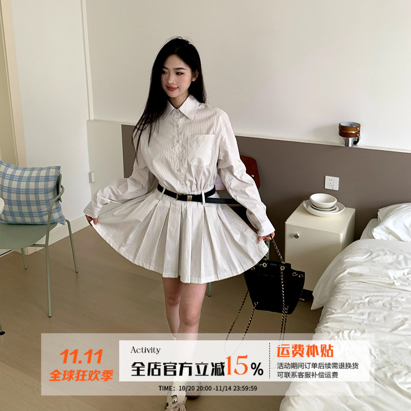 橘子树在哪儿条纹衬衫连衣裙女秋季款设计感长袖收腰a字百褶短裙