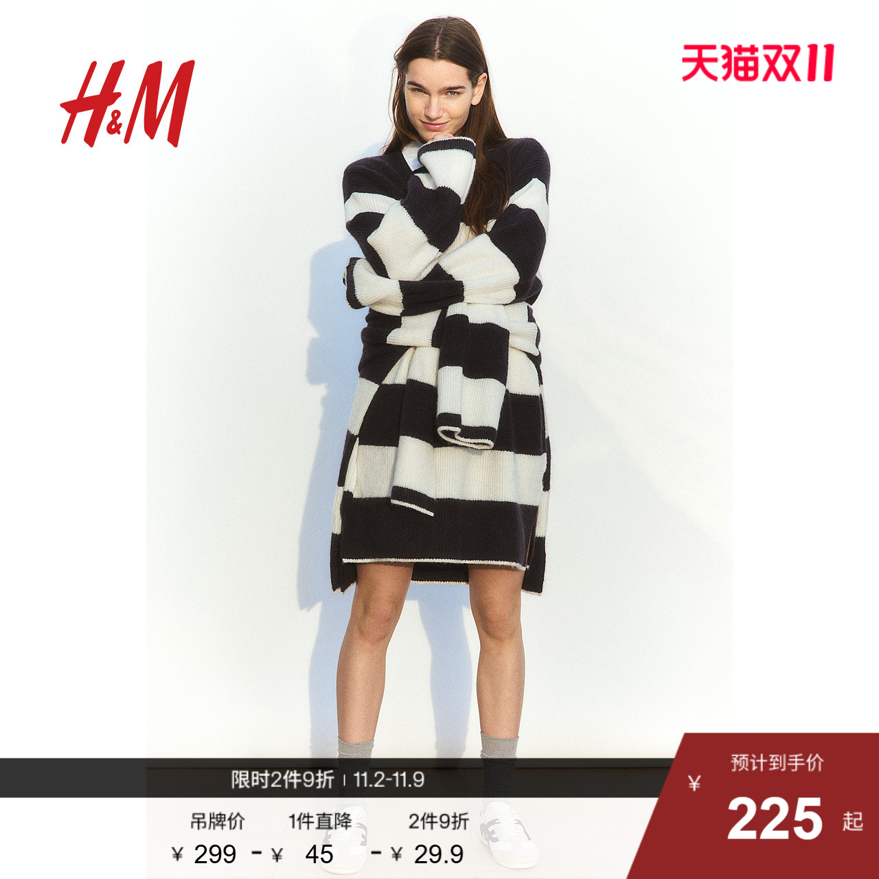 HM女装连衣裙2025秋季新款法式针织条纹圆领长袖中长裙1270558