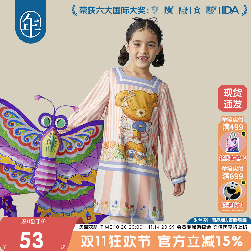 年衣童装女童连衣裙2025春秋新款熊太奇IP条纹印花长袖裙子