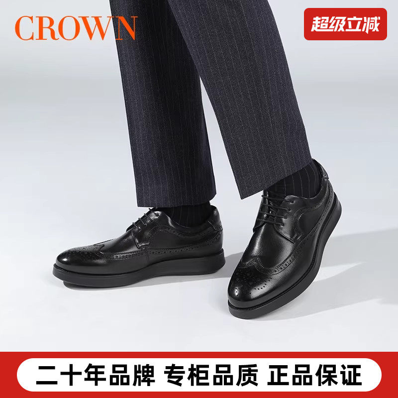 CROWN/皇冠商务皮鞋真皮轻质厚底德比鞋休闲圆头雕花布洛克男鞋