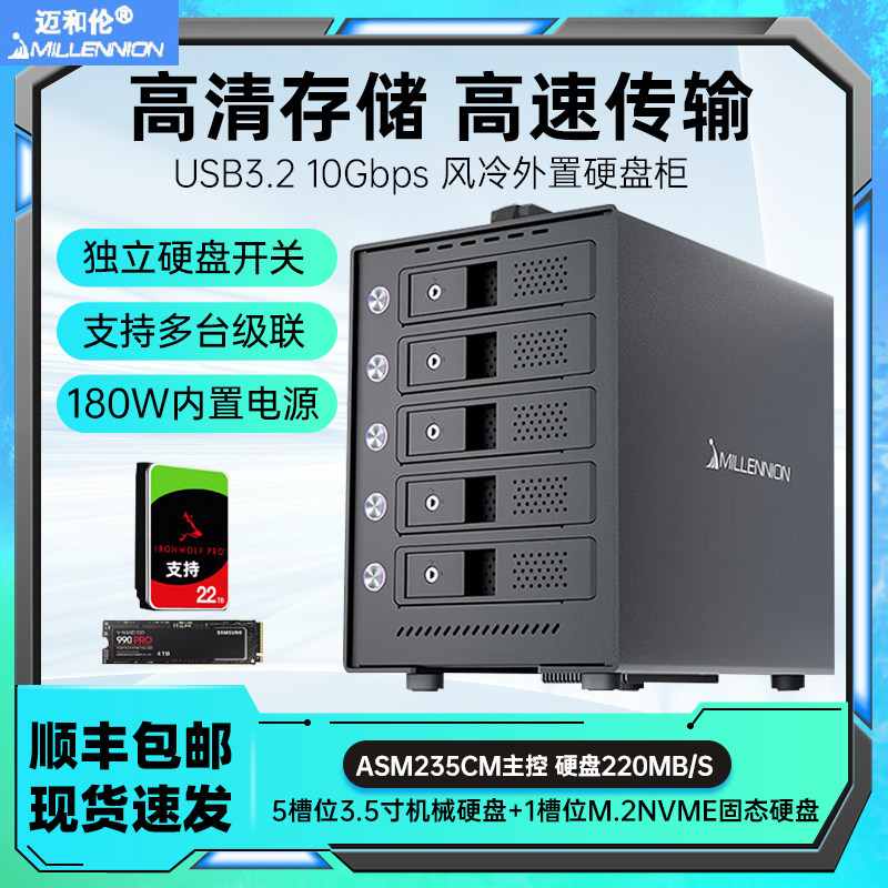 迈和伦3.5英寸5盘位SATA+NVME固态高速USB3.2移动硬盘盒独立开关