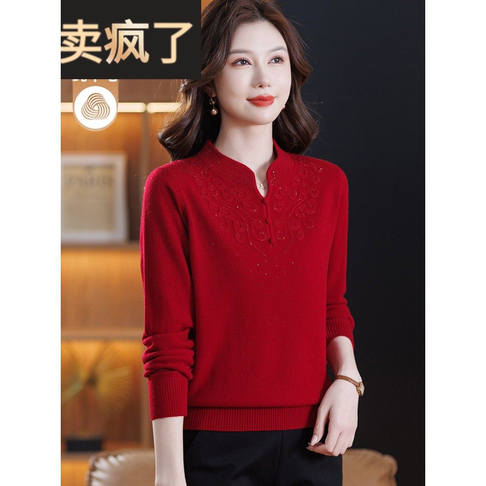 100%羊毛衫女妈妈装秋冬内搭打底衫中老年旗袍领本命年红色毛衣