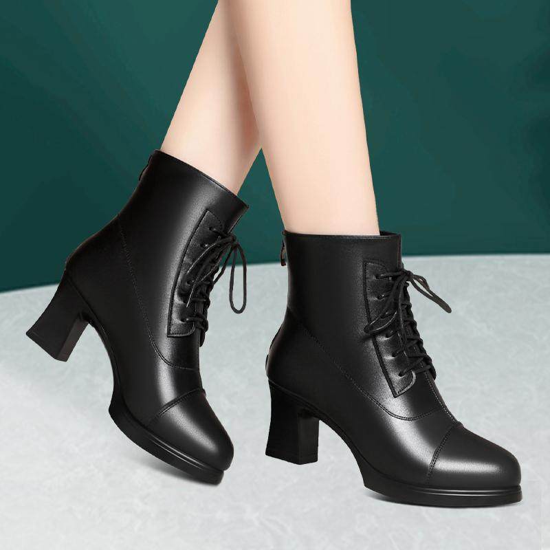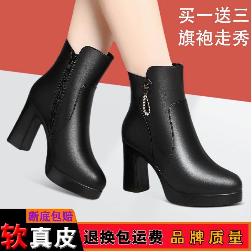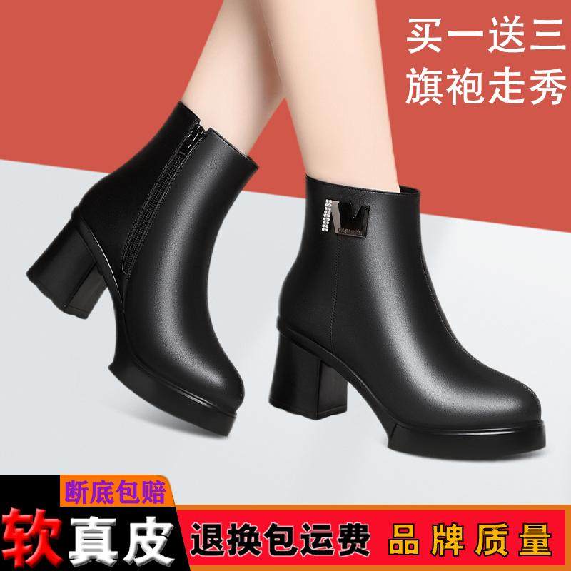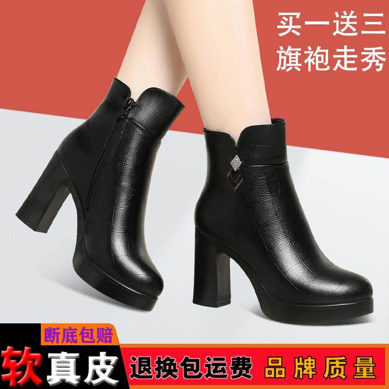 2024秋冬防水厚底短筒靴中老年旗袍走秀鞋加绒保暖女士皮靴高跟鞋
