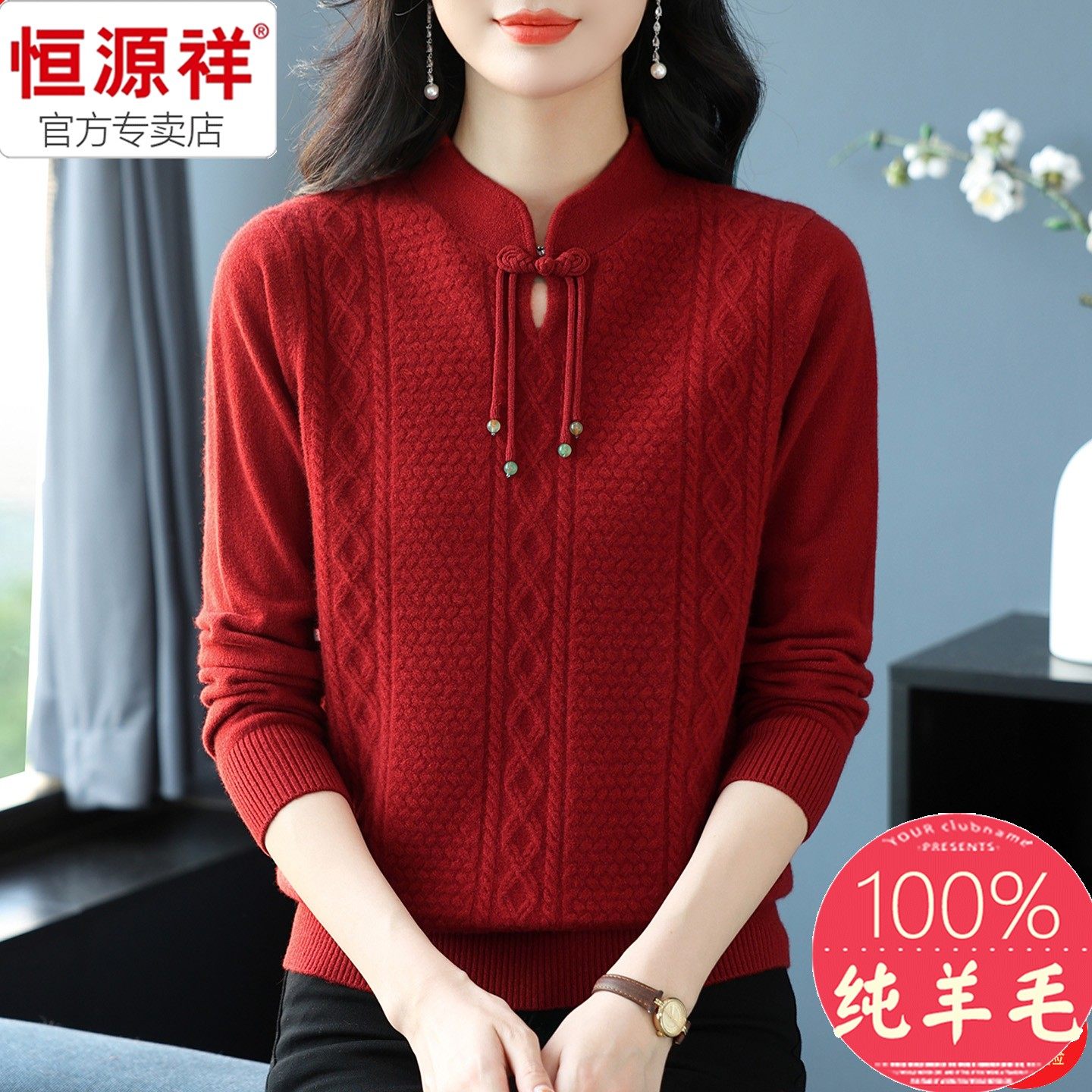 恒源祥高端品质纯羊毛女中老年旗袍领盘扣宽松显瘦新年款红色毛衣